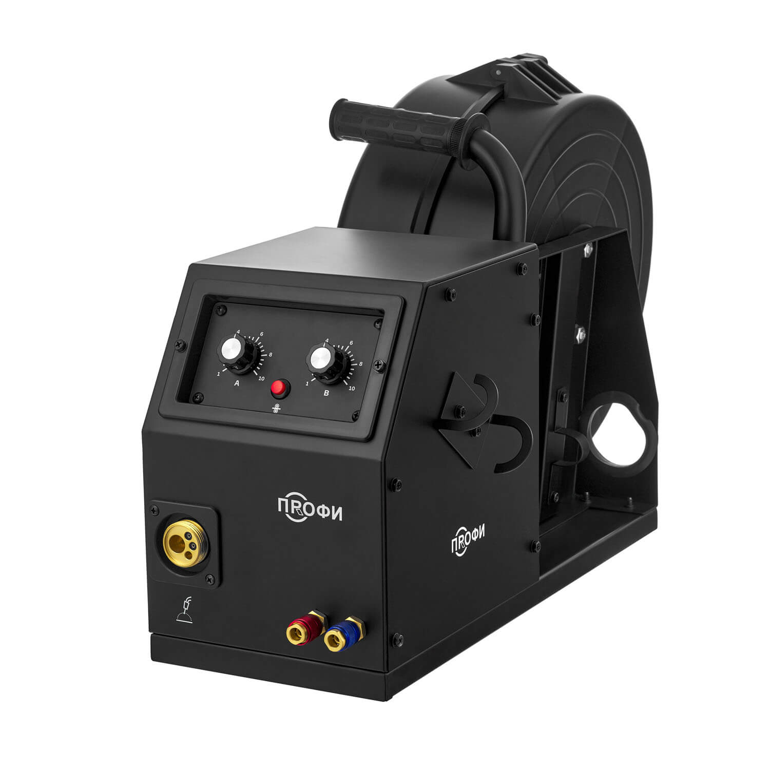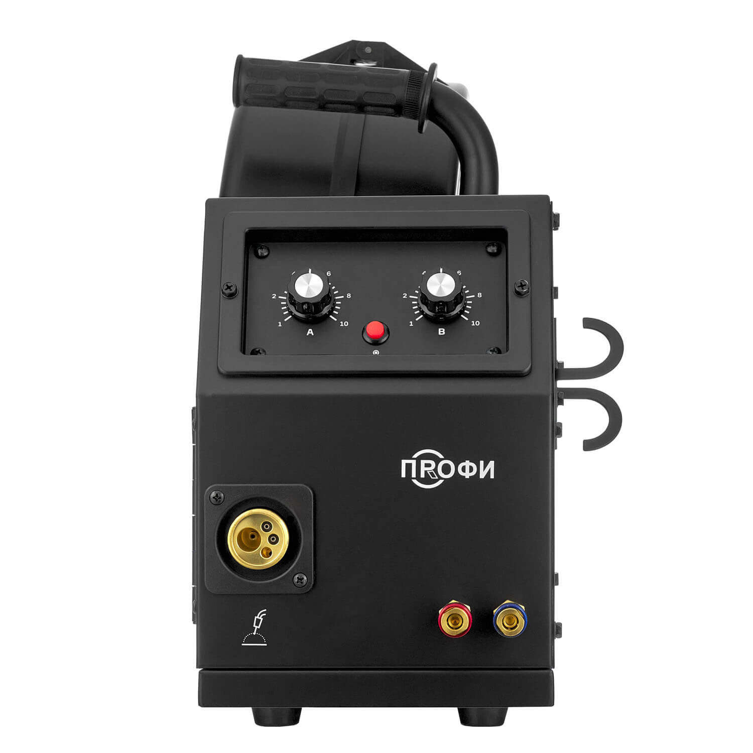 На передней панели установлены регуляторы скорости подачи проволоки и сварочного напряжения, кнопка протяжки проволоки, разъемы для подключения сварочной горелки MIG с водяным охлаждением.