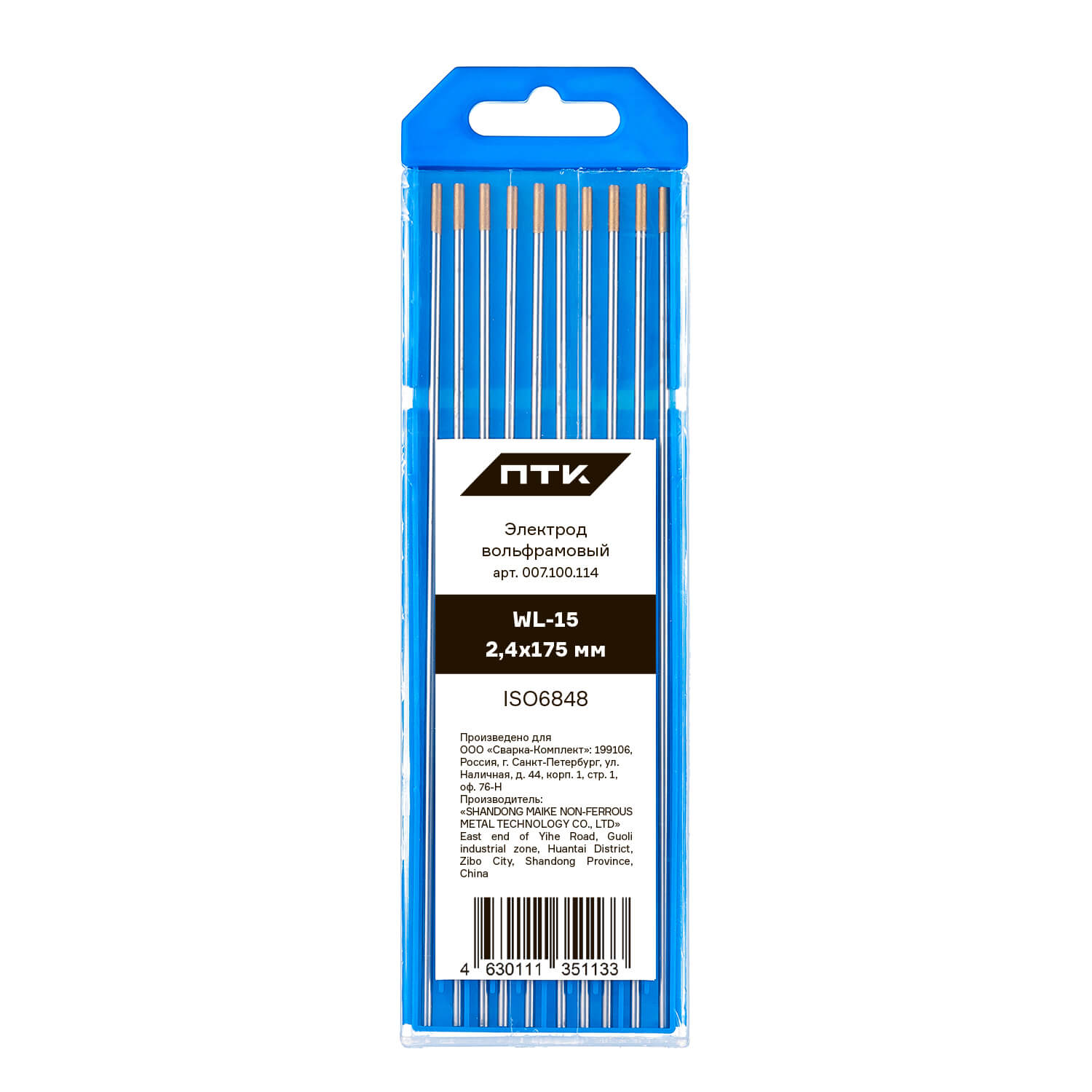 Диаметр электрода 2,4 мм, длина электрода 175 мм. Вольфрам имеет отличительное цветовое обозначение – золотой торец.