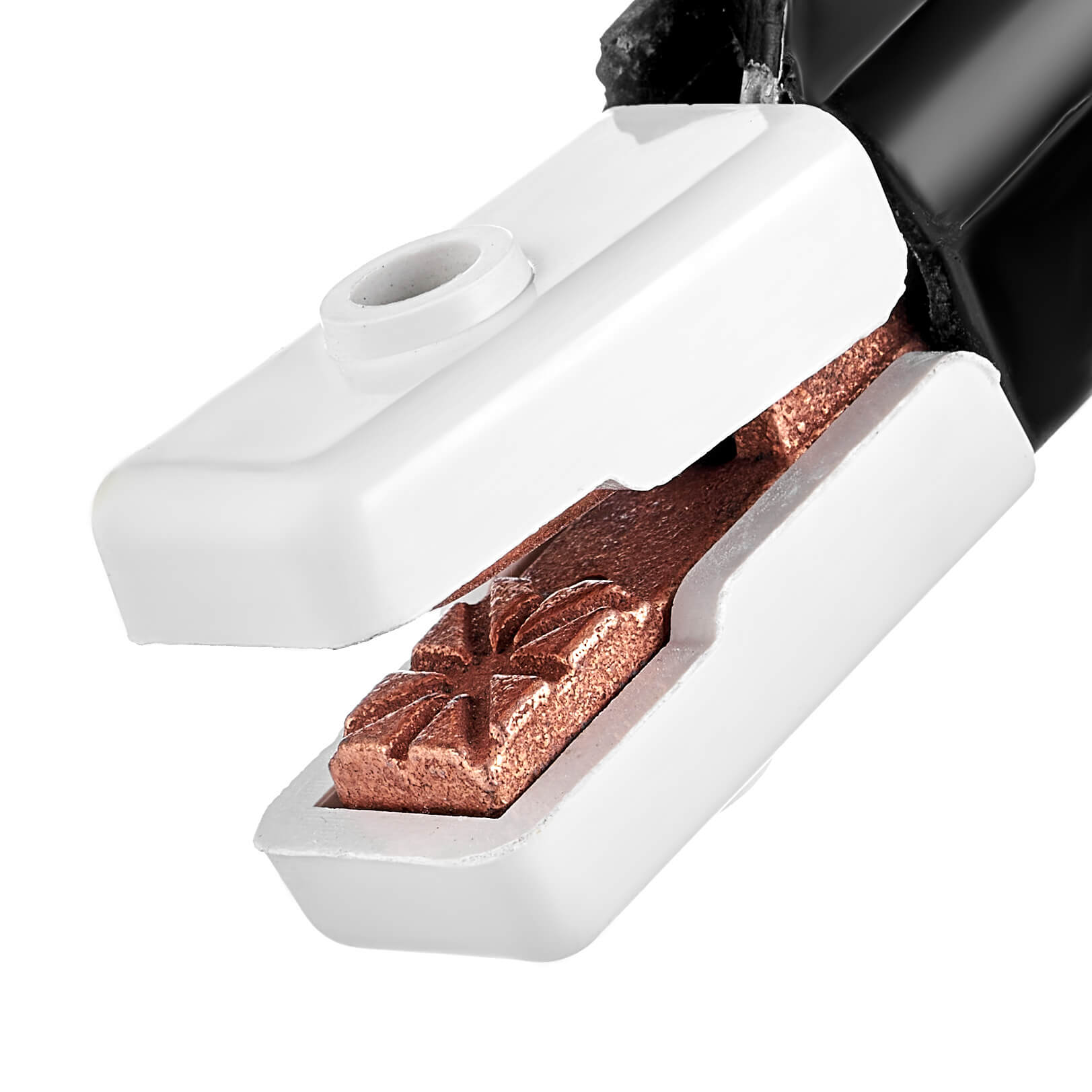 Отличительная особенность электрододержателей серии ЭД 1-B заключается в том, что сварочный кабель вставляется в зажимной элемент, сверху устанавливается прижимная пластина и все это затягивается двумя болтами М6.