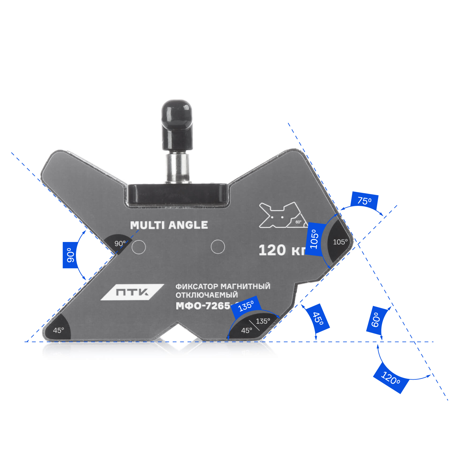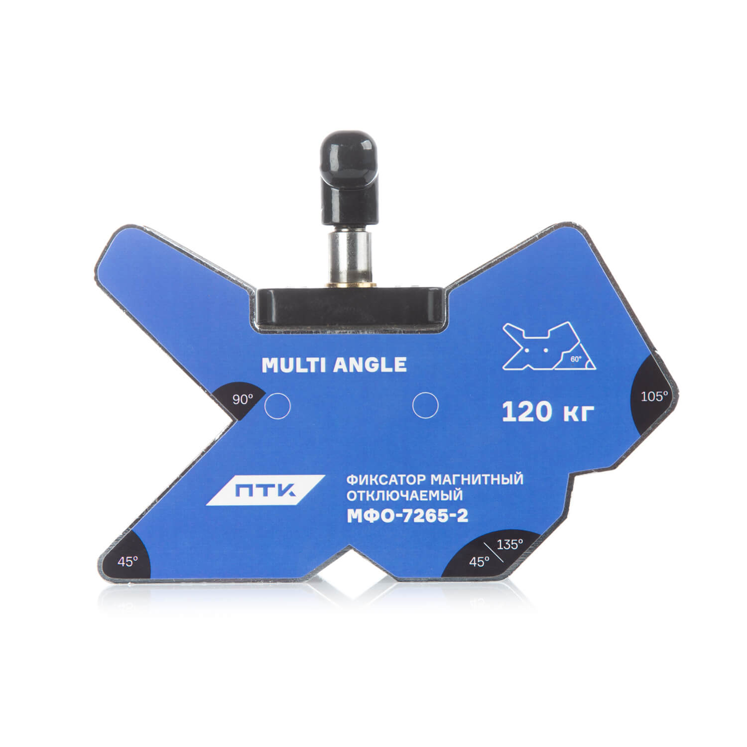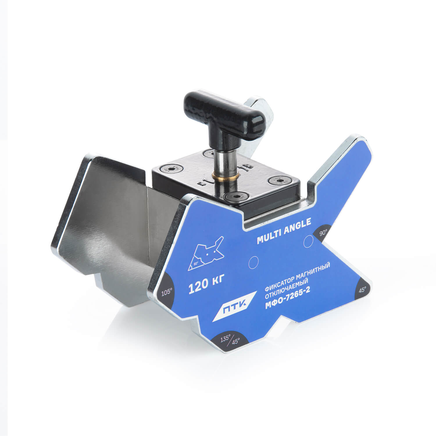 Особенности фиксатора магнитного МФО-7265-2:- Мощный неодимовый магнит обеспечивает надежную и безупречную фиксацию МФО-7265-2 к изделию.Магнит и сам фиксатор устойчив к нагреву и воздействию высоких температур.Наличие удобной рукоятки включения и отключения фиксатора и его перемещение с одной свариваемой детали на другую.Фиксатор можно крепить к плоским и круглым поверхностям. Конструкция МФО MULTI ANGLE предусматривает наличие специальных пазов для фиксации металлических труб.Большое количество углов, в том числе и не стандартных, обеспечат комфортное выполнение работ любой сложности. Доступные углы фиксации – 45°, 60°, 75°, 90°, 105°, 120°, 135°.Установка деталей под углом 90° возможна только при расположении фиксатора снаружи деталей (270°), что очень удобно при отсутствии доступа к внутреннему углу.Комплектация:
