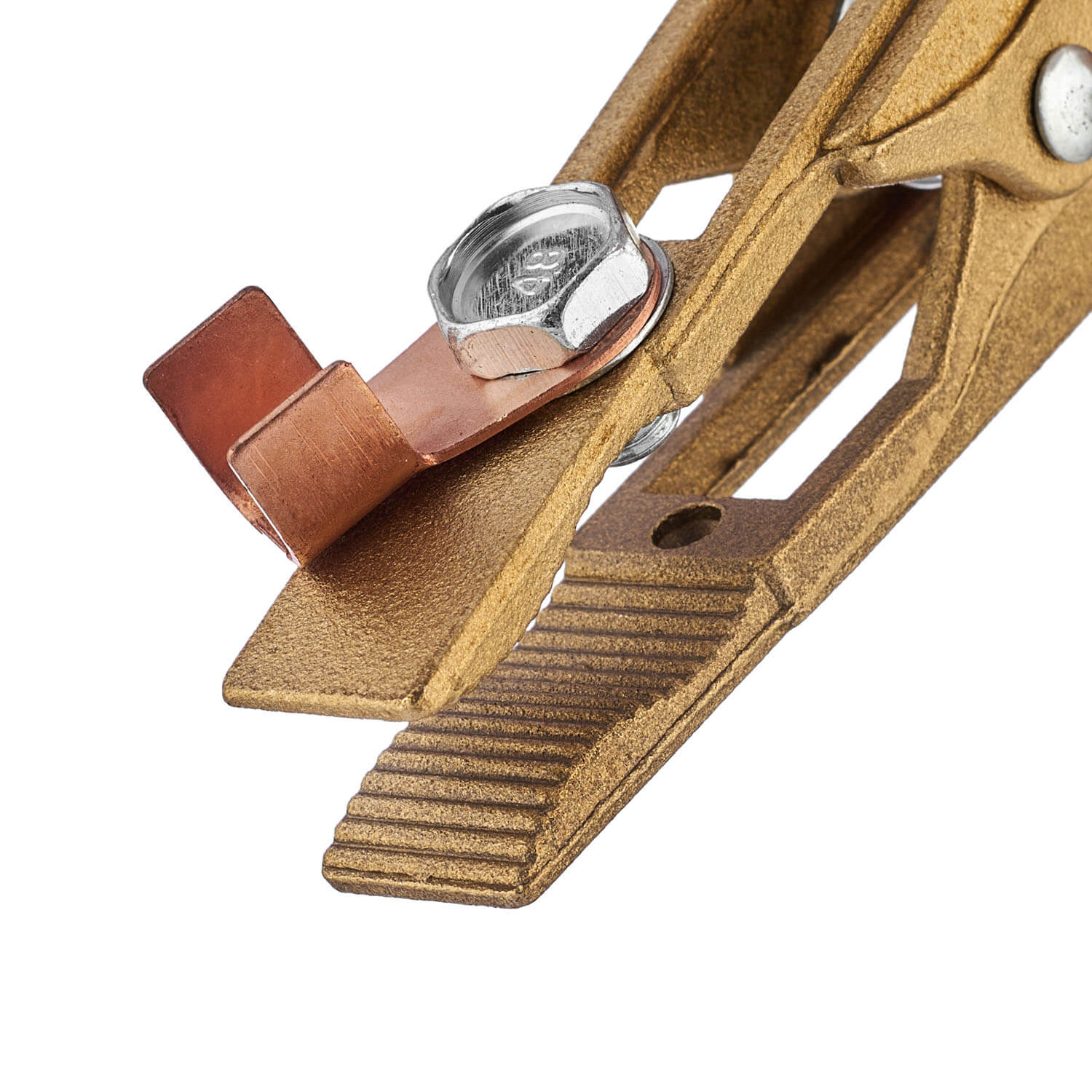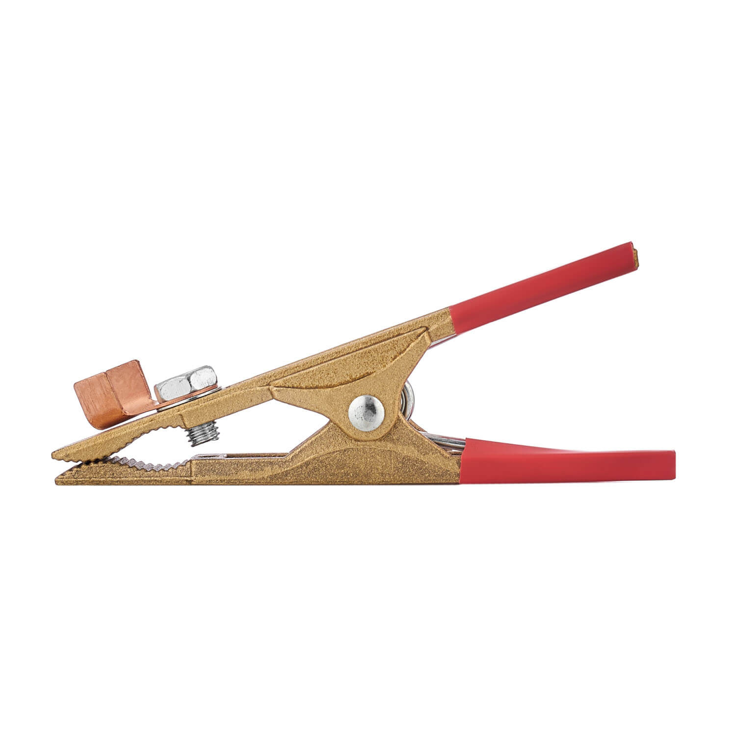 Клемма изготовлена из латуни. Литой корпус и мощная пружина гарантируют увеличенный срок эксплуатации. Съемная изоляция на ручках обеспечит безопасность при выполнении сварочных работ.