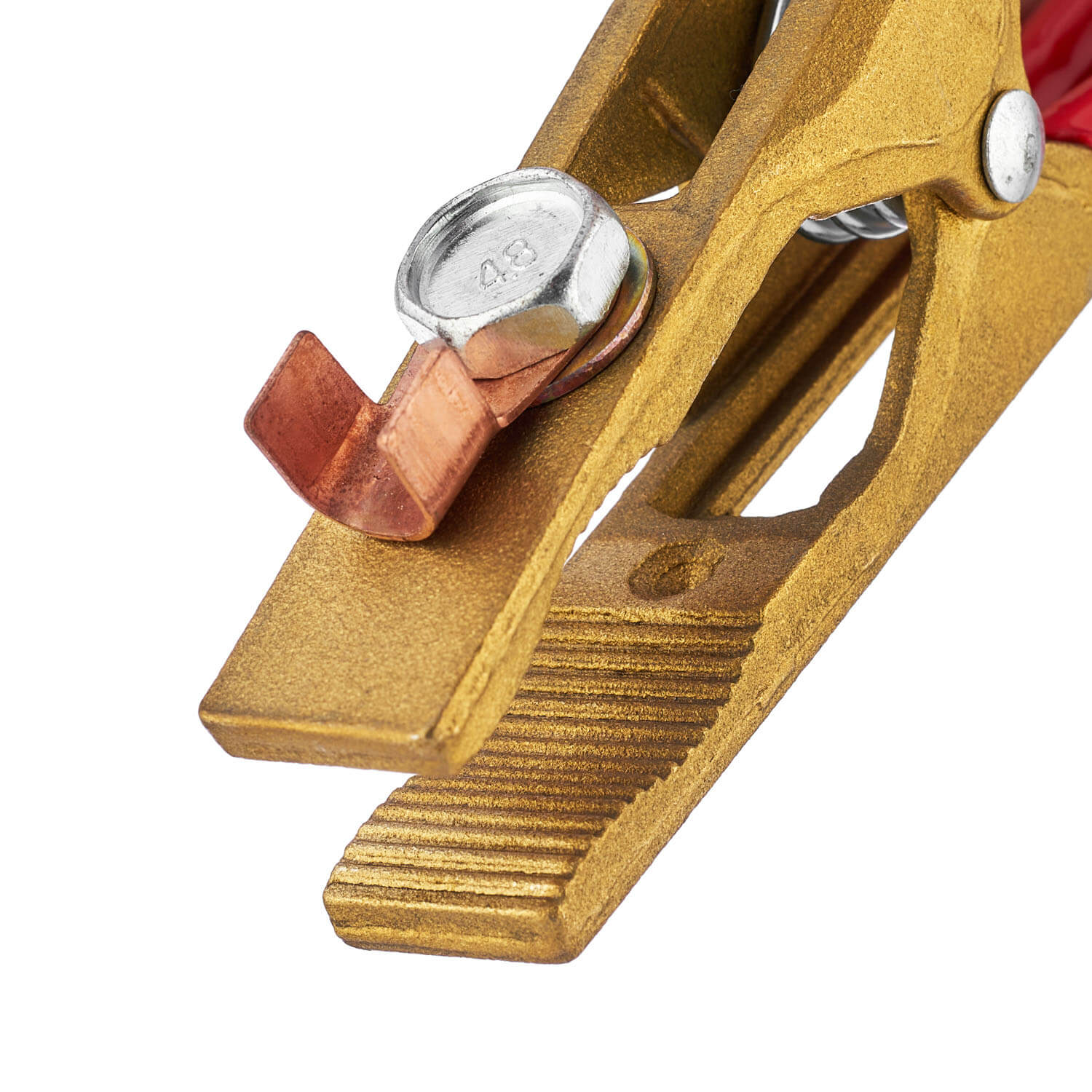 Клемма изготовлена из латуни. Литой корпус и мощная пружина гарантируют увеличенный срок эксплуатации. Съемная изоляция на ручках обеспечит безопасность при выполнении сварочных работ.