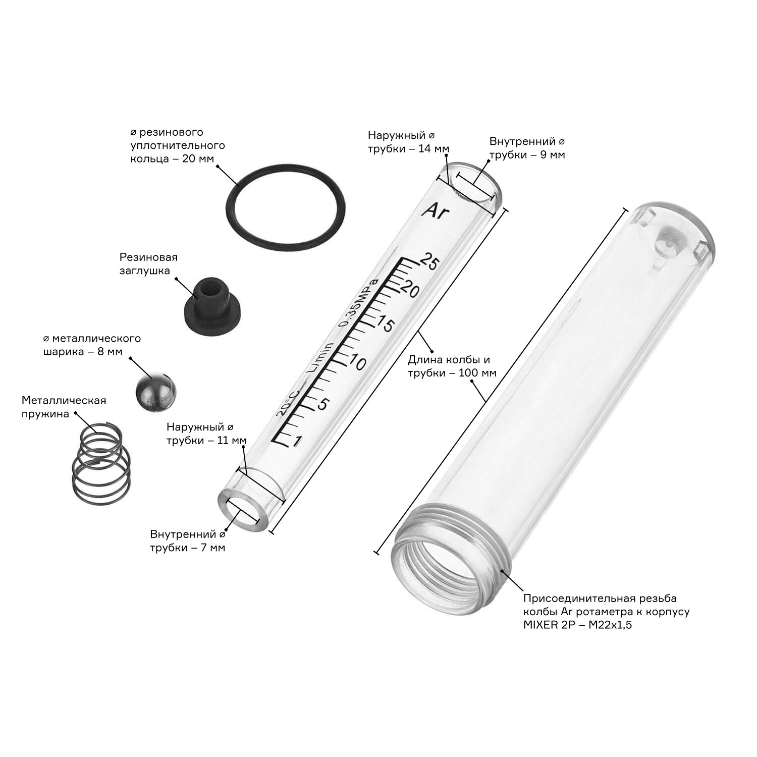 Колба выполнена из прозрачного пластика, по нижнему краю расположена резьба М22х1,5 для подсоединения к MIXER 2Р. Внутри наружной колбы, размещена малая пластиковая колба для шарика-поплавка. На ней нанесена шкала расхода аргона, которая показывает расход газа. Диапазон измерений от 1 до 25.