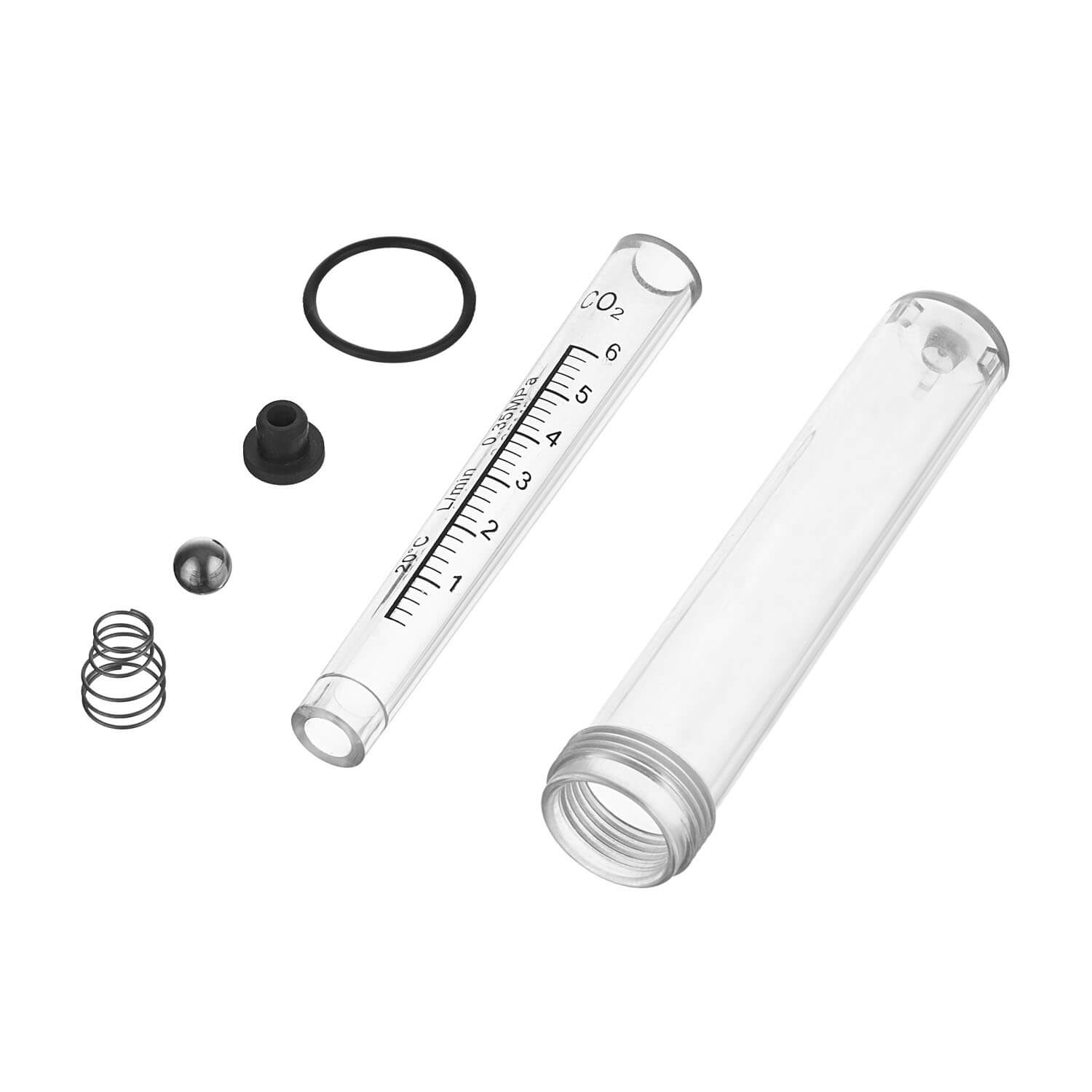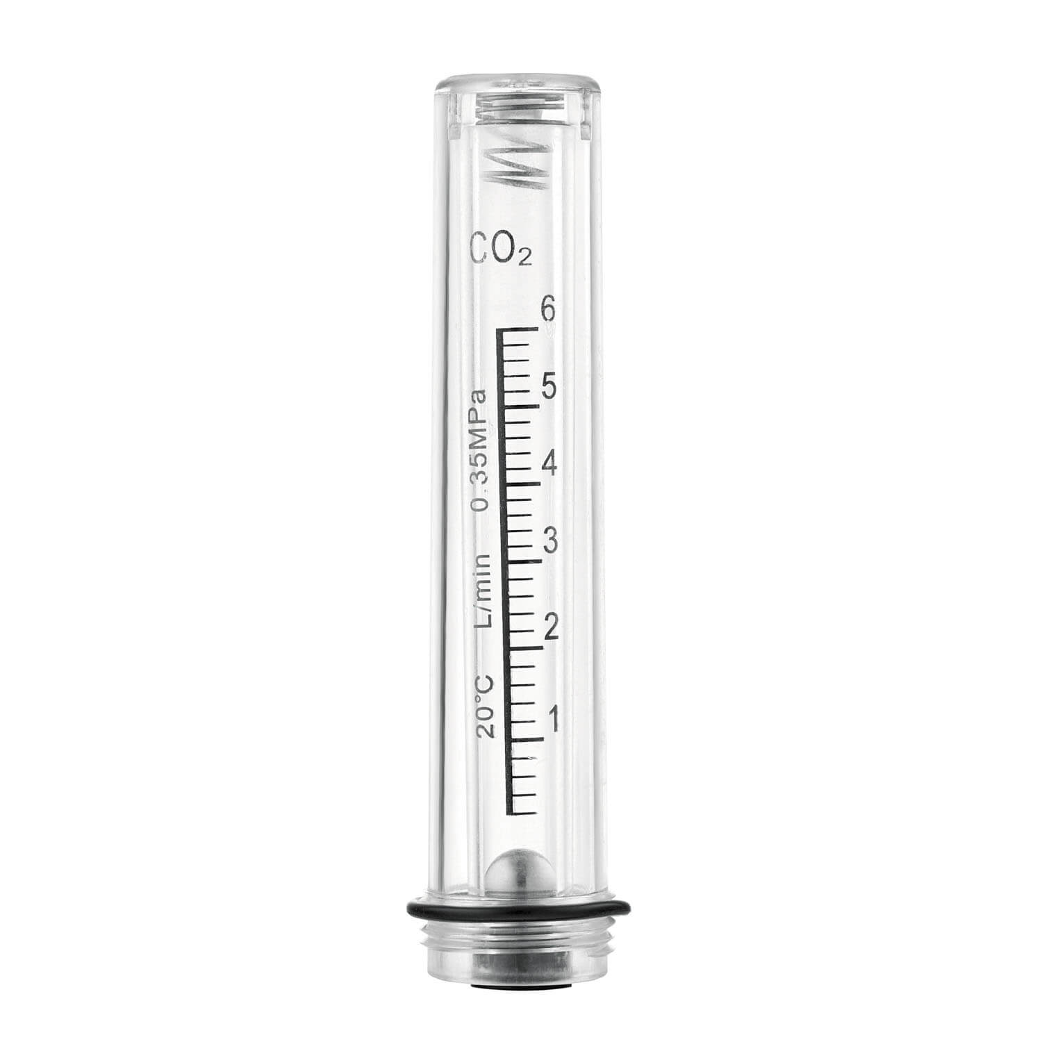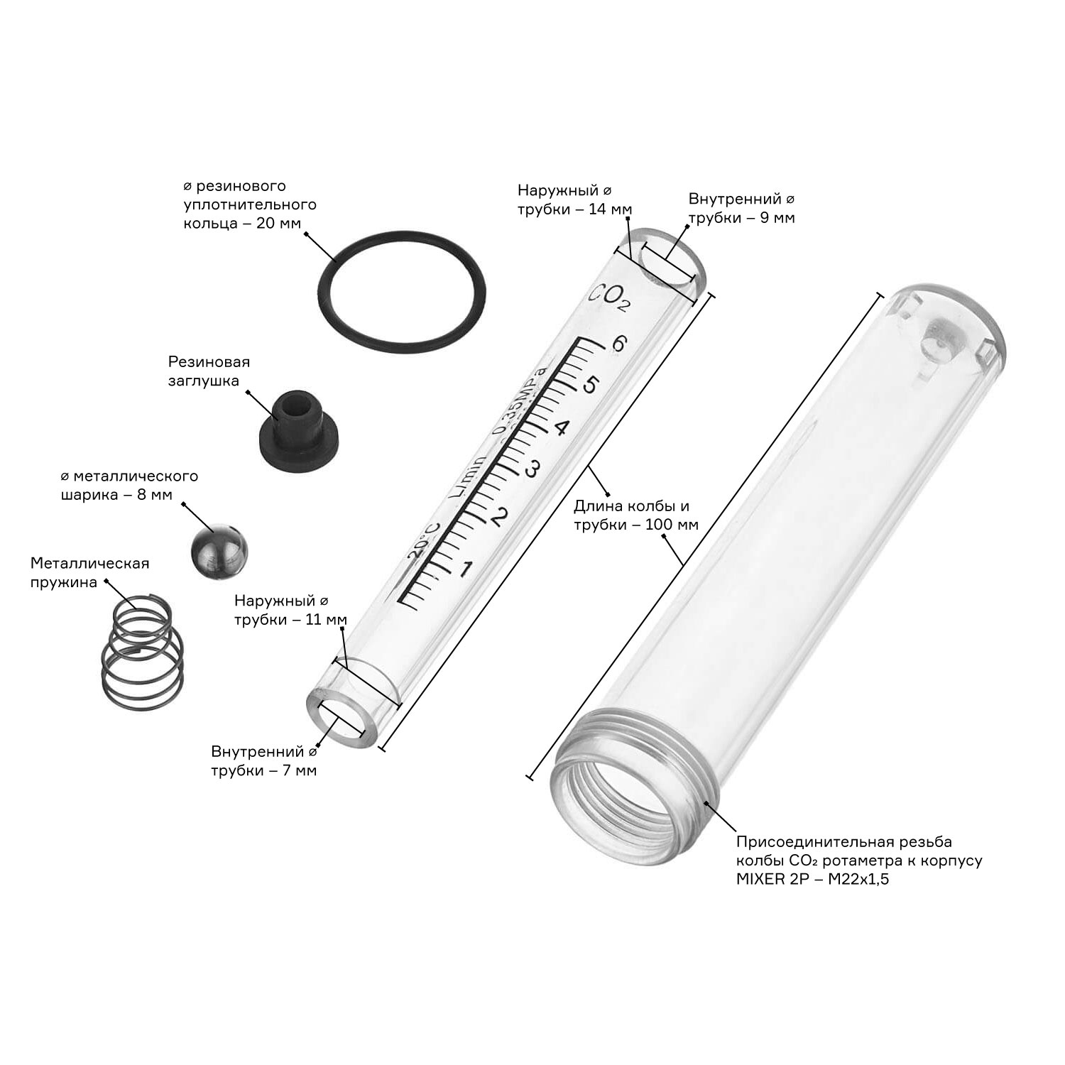 Колба выполнена из прозрачного пластика, по нижнему краю расположена резьба М22х1,5 для подсоединения к MIXER 2Р. Внутри наружной колбы, размещена малая пластиковая колба для шарика-поплавка. На ней нанесена шкала расхода углекислоты, которая показывает расход газа. Диапазон измерений от 0 до 6.