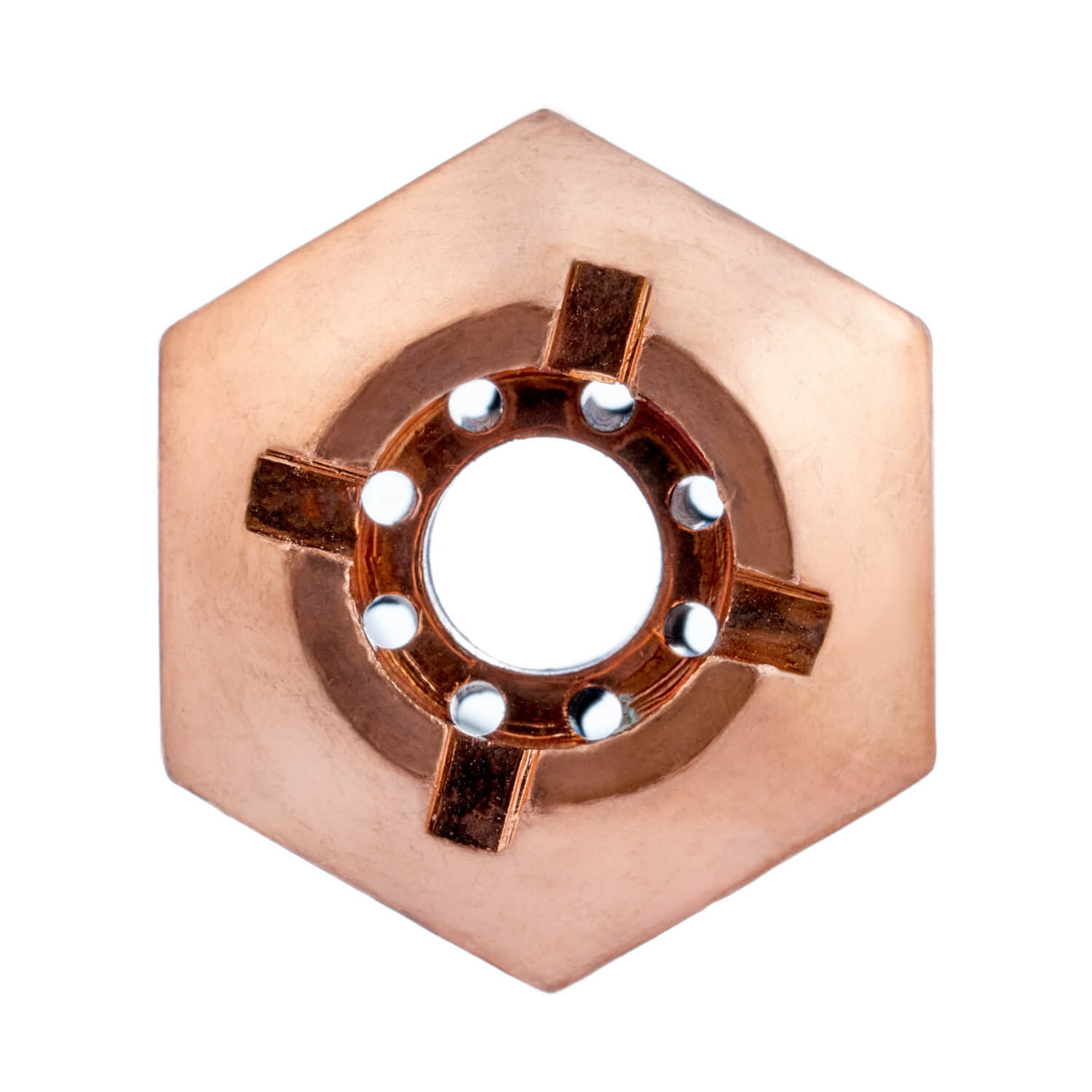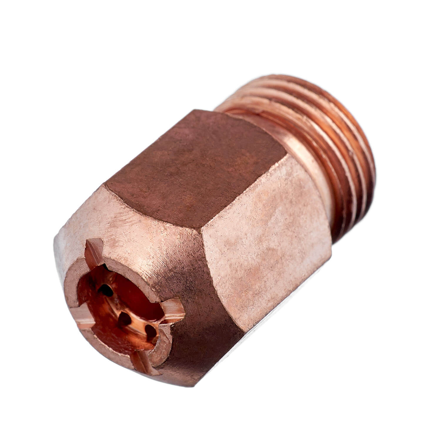 Наружный мундштук для керосинореза РК-02 изготовлен из меди. Имеет пазы для выхода пламени при случайном перекрытии сопла о разрезаемую деталь. Выходные отверстия мундштука расположены в форкамере (углублении), что дополнительно привязывает подогревающее пламя к мундштуку, обеспечивая максимальный нагрев. Мундштук имеет многопламенную конструкцию (8 отверстий) по диаметру для выхода пламени и его фокусировки в точку нагрева, что максимально обеспечивает концентрацию тепла в зоне режущей струи.