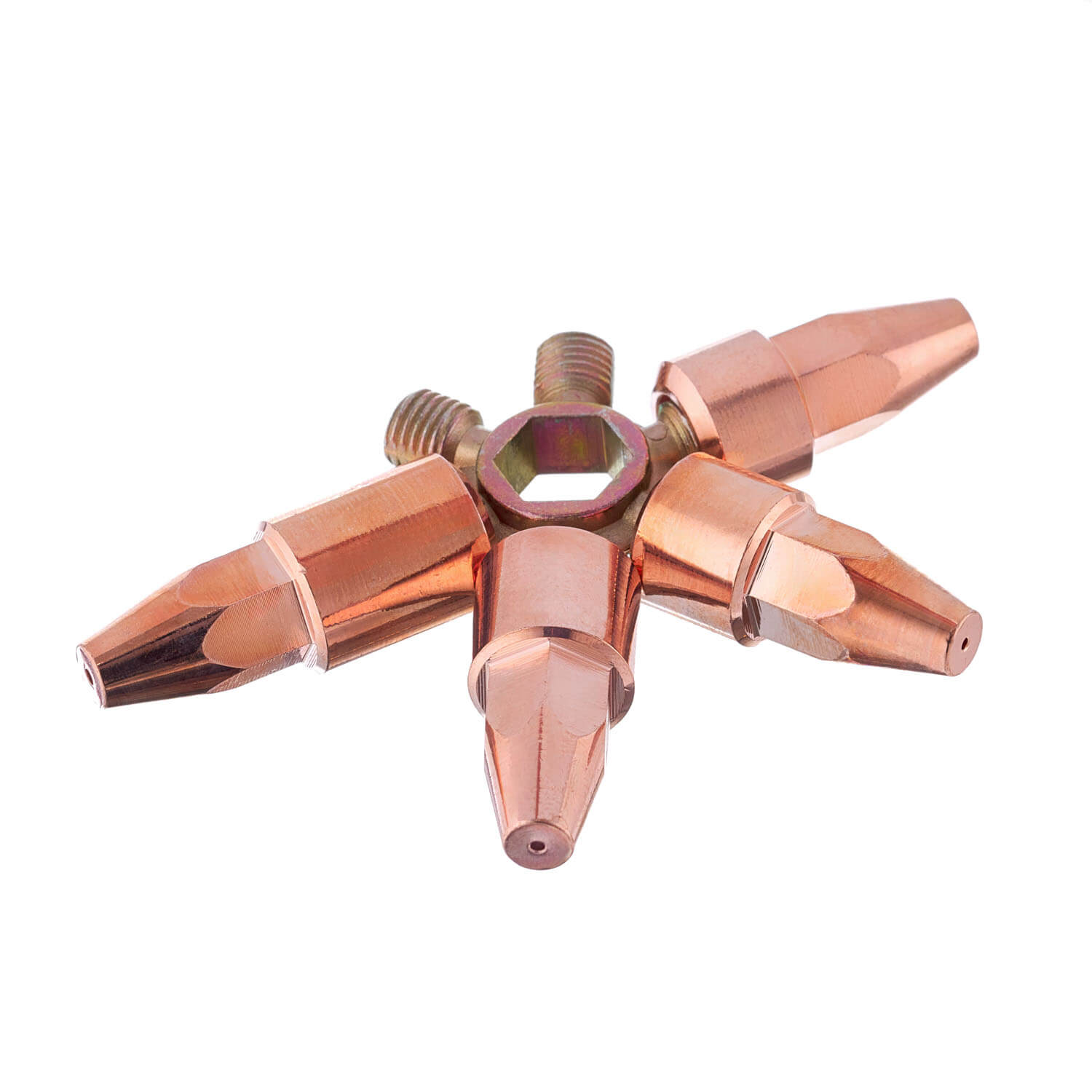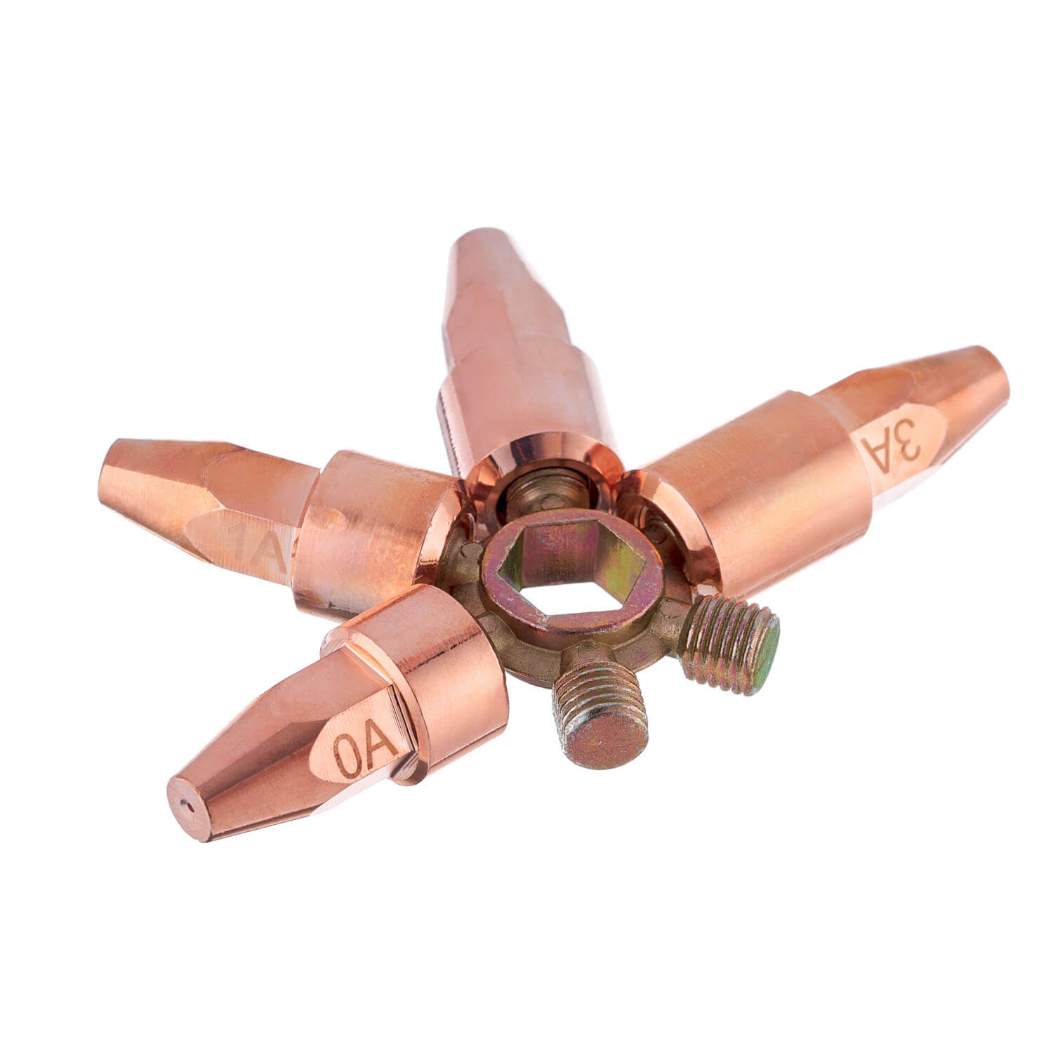 Набор мундштуков и ключа-звездочки для инжекторной ацетиленовой горелки Г2А-05 «Звездочка». В набор входит специальный ключ-звездочка для хранения мундштуков из набора. Набор состоит из четырех мундштуков для газопламенной обработки металлов толщиной до 4 мм. Все мундштуки изготовлены из меди.