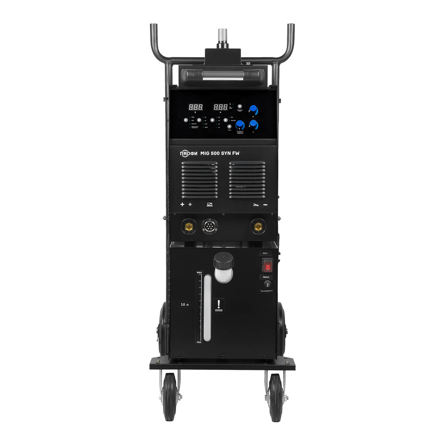 Полуавтомат ПРОФИ MIG 500 SYN FW поставляется с блоком водяного охлаждения объемом до 10 литров и с тележкой-платформой, для легкого и комфортного перемещения и эксплуатацию оборудования. Тележка оснащена надежной усиленной конструкцией. На нее можно установить сварочный источник, выносной подающий механизм, блок жидкостного охлаждения и газовый баллон объемом 40 литров.