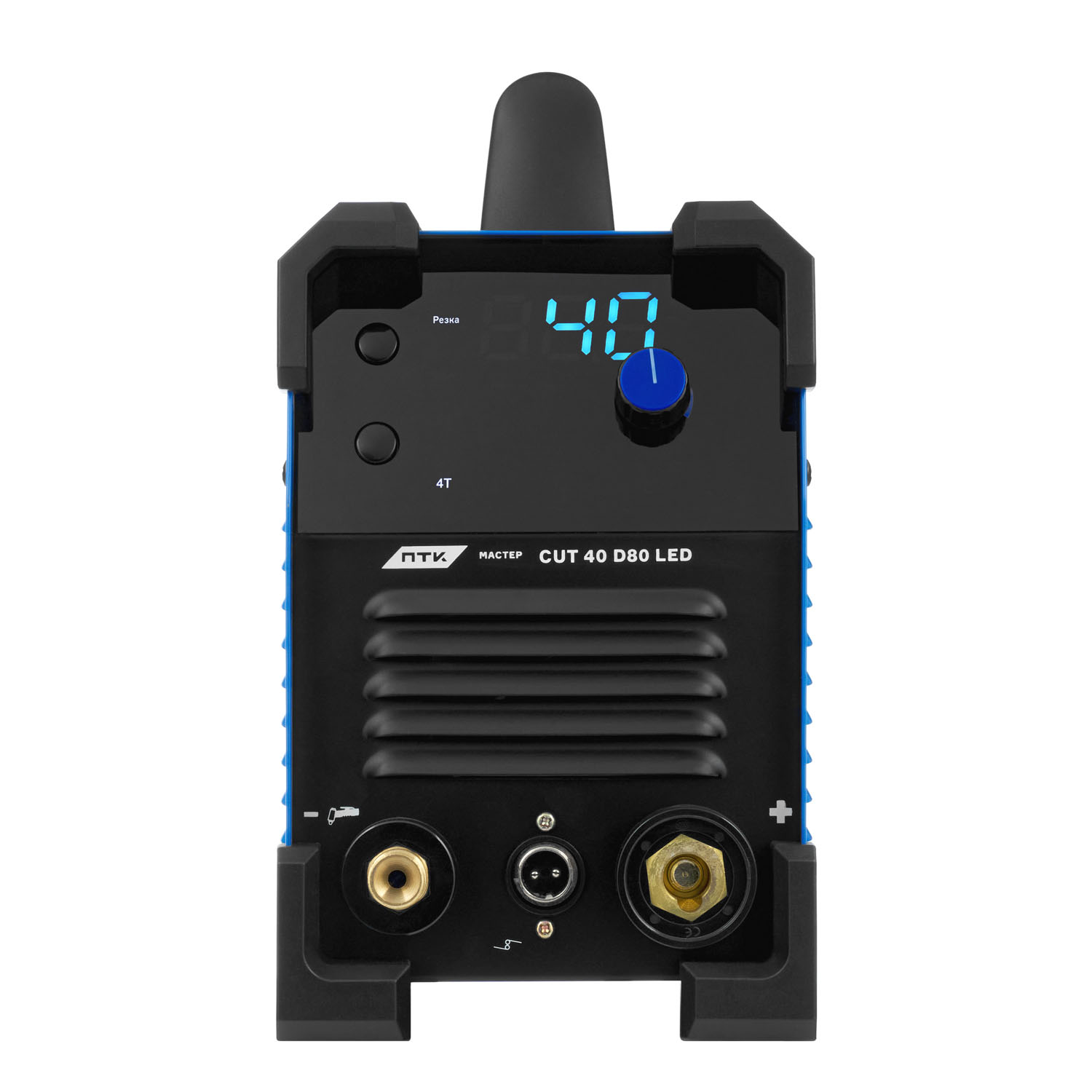 Особенности ПТК МАСТЕР CUT 40 D80 LED:LED дисплей с динамическими индикаторами.Специальная циклограмма с отображением параметров для настройки времени предварительной подачи газа, тока реза и времени последующей подачи газа.Бесконтактный способ возбуждения дуги.Максимальная толщина разрезаемого металла 12 мм.Наличие кнопки переключения режимов работы плазменного резака – 2Т/4Т, что обеспечивает удобство при выполнении коротких и длинных резов.Низкий уровень шума в процессе резки.Встроенная функция термозащиты с индикацией перегрева.Пластиковые уголки для защиты корпуса.Полная комплектация для начала работы.Гарантия 2 года.Комплектация:Аппарат воздушно-плазменной резки металлов – 1 шт.Плазменный резак 31 серии – 1 шт.Клемма заземления – 1 шт.Фильтр-регулятор – 1 шт.Газовый шланг – 1 шт.ЗИП и комплектующие – 1 наборРуководство по эксплуатации – 1 шт.