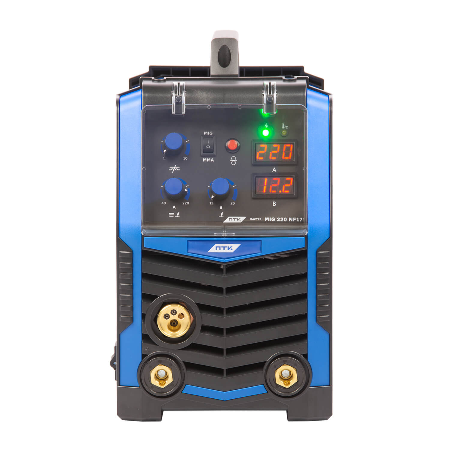 Особенности:Наличие регулируемой функции индуктивности, где при высокой индуктивности аппарат сваривает более мягко, дуга более широкая и эластичная. При низкой индуктивности дуга более сконцентрированная и жесткая.Наличие двух цифровых дисплеев для контроля параметров сварки — дисплей сварочного тока и напряжения дуги.Аппараты могут сваривать металлы на прямой полярности и обратной. Смена полярности позволяет сваривать металлы порошковой проволокой.На передней панели размещена кнопка холостого прогона проволоки.Металлический механизм подачи проволоки. В аппарат можно установить катушку с проволокой весом 5 и 1 кг.Дополнительная функция ручной дуговой сварки MMA. Позволяет использовать покрытые электроды диаметром от 1,5 до 4,0 мм.Высокий КПД и малый уровень потребления электроэнергии.Плавная регулировка сварочного тока.Эффективная система охлаждения.Встроенная функция термозащиты с индикацией перегрева.Гарантия 2 года.Комплектация ПТК МАСТЕР MIG 220 NF17:Инверторный аппарат полуавтоматической сварки — 1 шт.Полуавтоматическая горелка MIG 15 серии — 1 шт.Клемма заземления — 1 шт.ЗИП и комплектующие — 1 наборРуководство по эксплуатации — 1 шт.