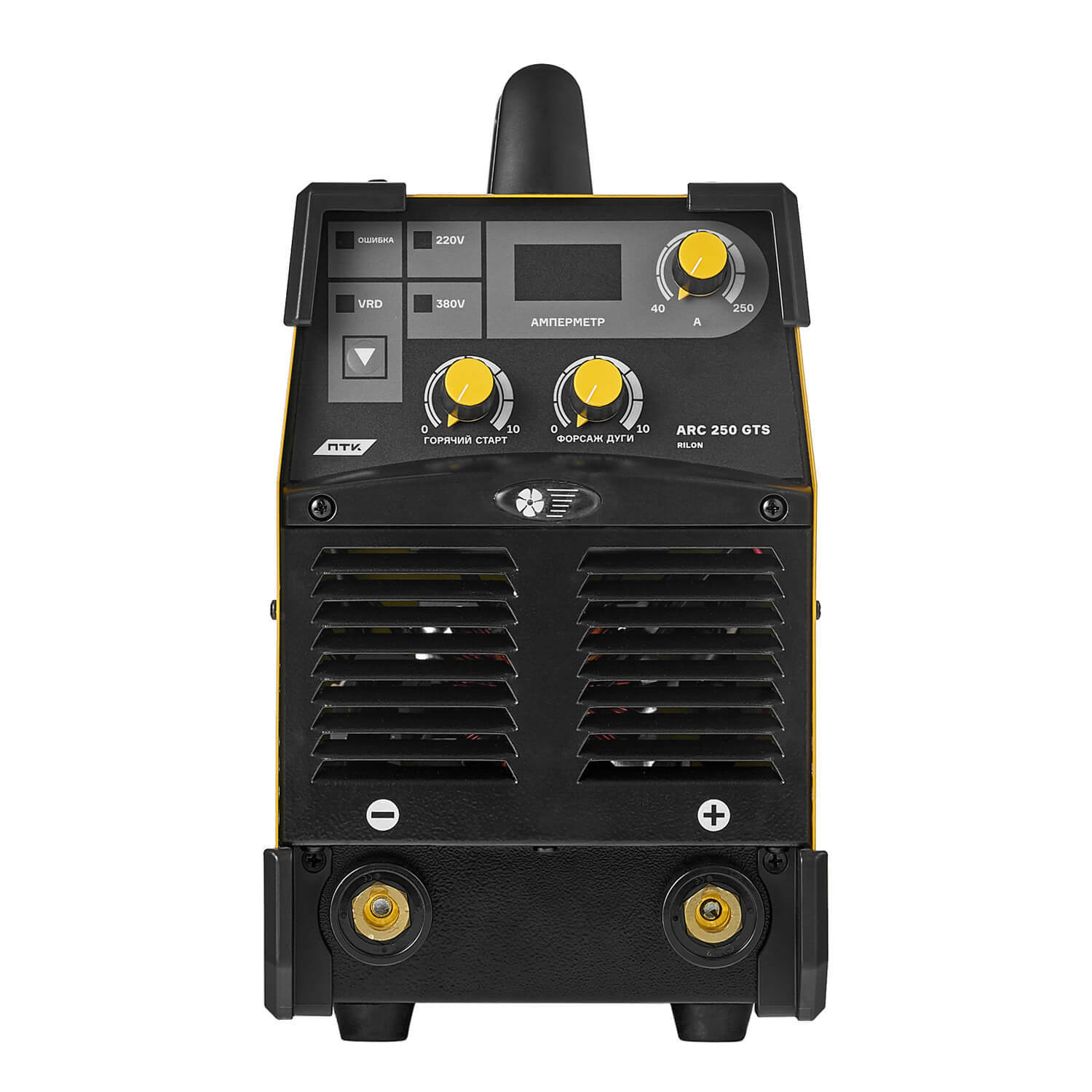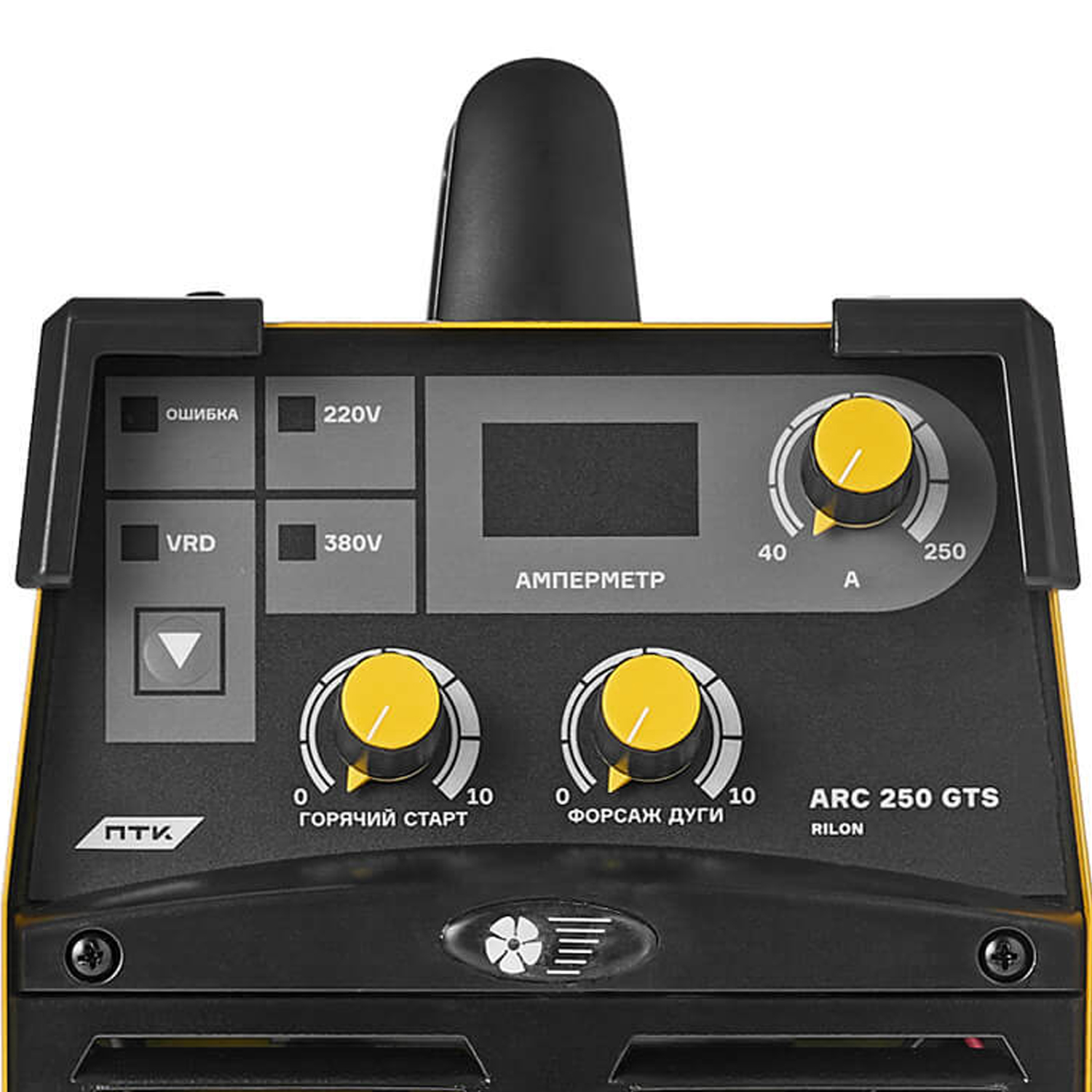 Особенности ПТК RILON ARC 250 GTS:Аппараты снабжены блоком автоматического распознавания питающей сети 220/380В.Подключаемая функция VRD снижает холостой ход источника при замыкании сети для безопасной работы.Регулируемый форсаж дуги (Arc Force) обеспечивает стабильную дугу за счет увеличения сварочного тока в момент отделения капли металла от электрода.Регулируемый горячий старт (Hot Start) обеспечивает подъем пикового тока в момент поджига дуги для идеального старта при работе с металлами разных толщин.Цифровая индикация тока позволяет производить точную настройку.Сварка электродами с рутиловым и основным покрытием.Функция автоматической защиты от перегрева.Гарантия 5 лет на аппараты серии ПТК RILON.Комплектация:Инверторный аппарат ручной дуговой сварки – 1 шт.Электрододержатель – 1 шт.Клемма заземления – 1 шт.Руководство по эксплуатации – 1 шт.