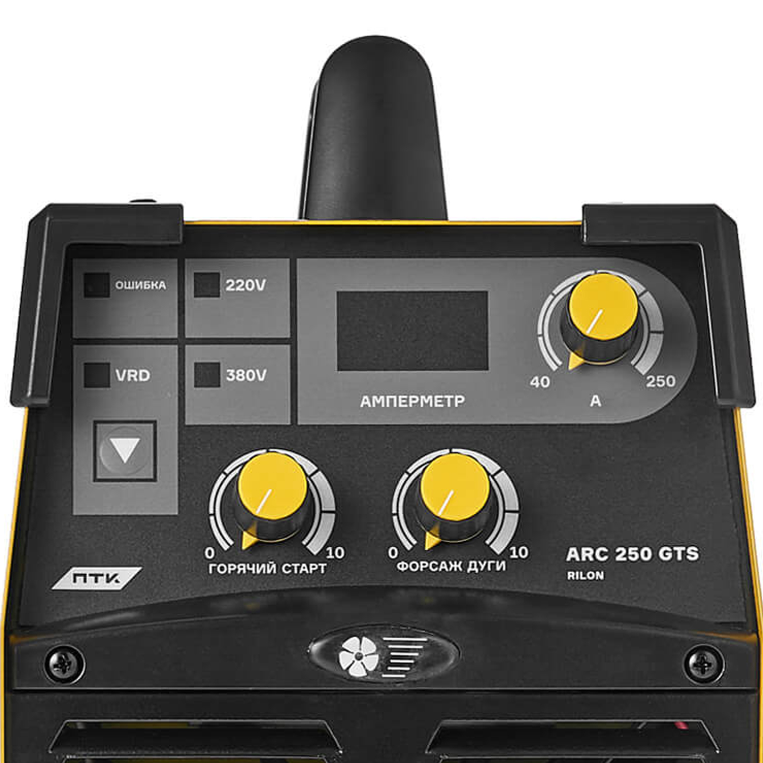 Особенности ПТК RILON ARC 250 GTS (НАКС):Аппараты снабжены блоком автоматического распознавания питающей сети 230/400В.Подключаемая функция VRD снижает холостой ход источника при замыкании сети для безопасной работы.Регулируемый форсаж дуги (Arc Force) обеспечивает стабильную дугу за счет увеличения сварочного тока в момент отделения капли металла от электрода.Регулируемый горячий старт (Hot Start) обеспечивает регулировку пикового тока в момент поджига дуги для идеального старта при работе с металлами разных толщин.Цифровая индикация тока позволяет производить точную настройку.Сварка электродами с рутиловым и основным покрытием.Функция автоматической защиты от перегрева.Гарантия 5 лет на аппараты серии ПТК RILON.Комплектация:Инверторный аппарат ручной дуговой сварки – 1 шт.Электрододержатель – 1 шт.Клемма заземления – 1 шт.Руководство по эксплуатации – 1 шт.Свидетельство об аттестации НАКС – 1 шт.