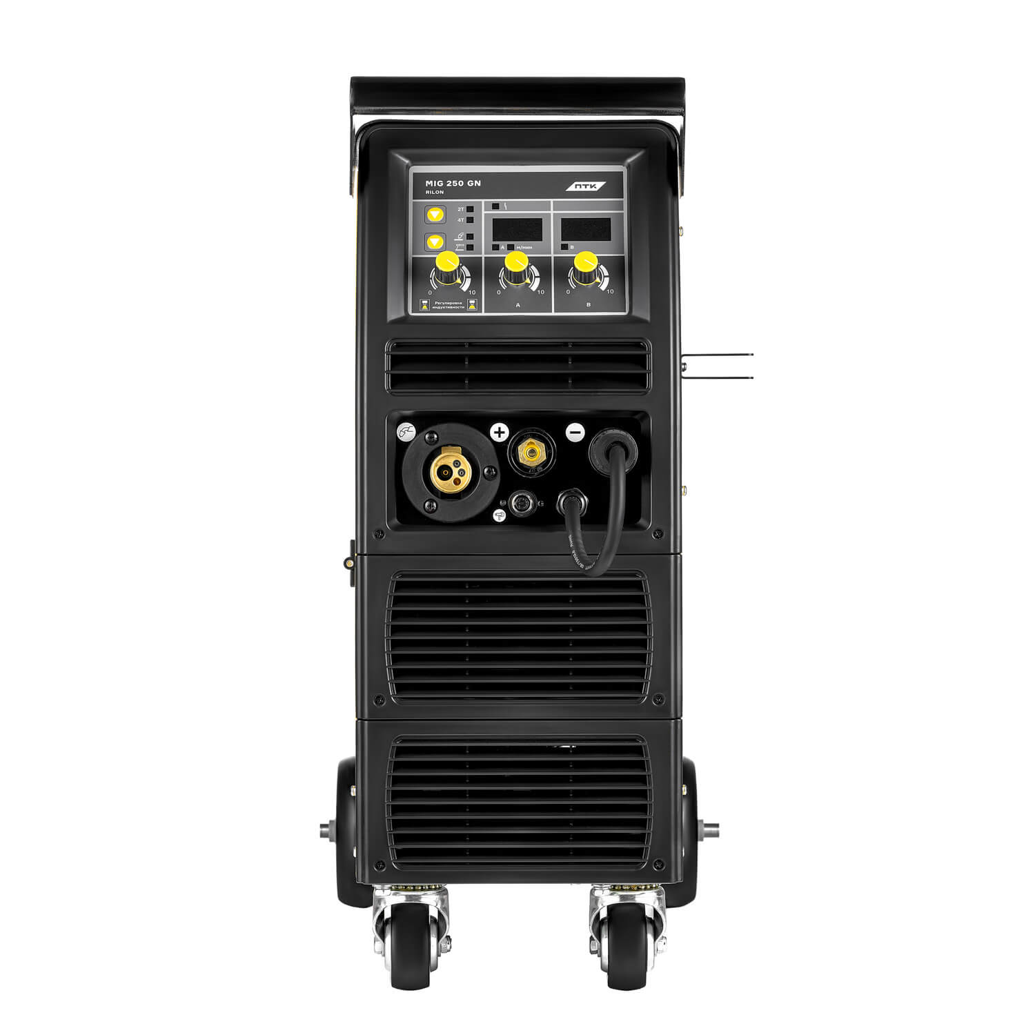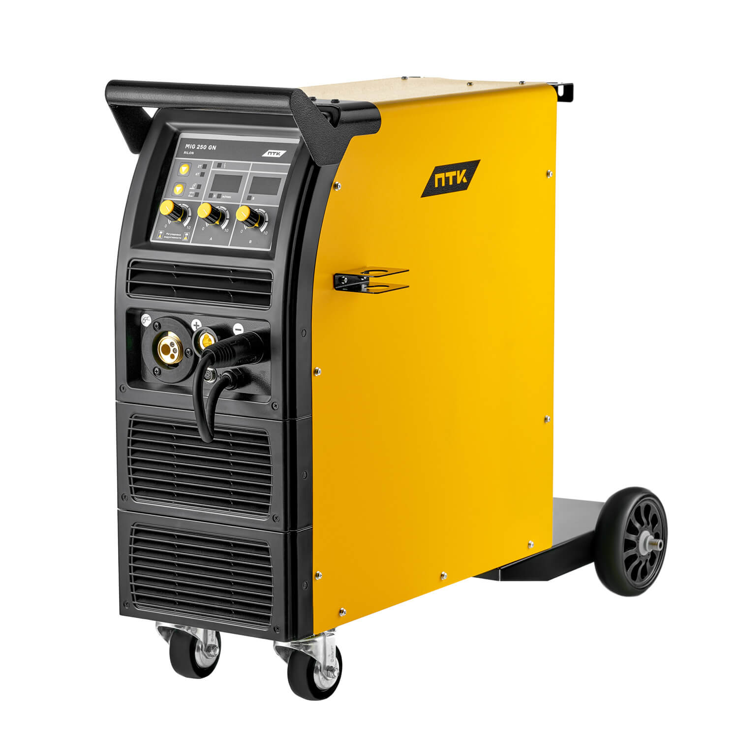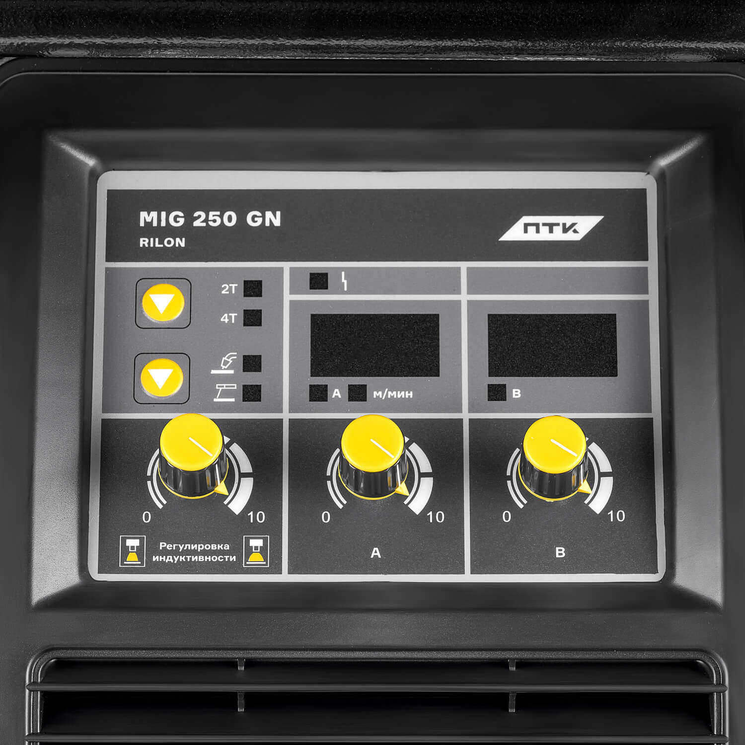 Особенности ПТК RILON MIG 250 GN:Аппарат способен производить сварку алюминия как обычной горелкой, так и горелкой Spool gun. Для сварки алюминиевой проволокой необходимо использовать ролики подающего механизма 30х10х12 U 0,8–1,0 и 30х10х12 U 1,0–1,2.На передней панели аппарата находится многофункциональный дисплей с возможностью регулировок силы сварочного тока, сварочного напряжения, индуктивности, регулировки скорости подачи проволоки и других параметров сварочного процесса.Функция индуктивности. При высокой индуктивности аппарат сваривает более мягко, дуга более широкая и эластичная. При низкой индуктивности дуга более сконцентрированная и жесткая.2Т/4Т режимы работы сварочной горелки. Функция применяется при сварке коротких или длинных швов.Дополнительная функция ручной дуговой сварки MMA. Аппарат позволяет использовать штучные электроды диаметром от 1,5 до 5,0 мм.4-х роликовый металлический механизм подачи проволоки. Используется сварочная проволока диаметром от 0,8 до 1,0 мм. Возможно установить катушку с проволокой весом до 18 кг (D300) и регулировать скорость подачи проволоки от 3 до 13 м/мин.В аппарате MIG 250 GN есть возможность подключения горелки Spool gun через разъем 7 pin на передней панели аппарата. Горелка не входит в комплект поставки и приобретается отдельно.Наличие кнопки прогона проволоки без газа.На задней панели аппарата размещена розетка для подогревателя газа на 36 Вольт.Функция автоматической защиты от перегрева.Сборная платформа для перемещения газового баллона и съёмная боковая полка для сварочной горелки и ЗИП. Наличие в корпусе аппарата скрытого ящика для инструментов.Гарантия 5 лет на аппараты серии ПТК RILON.Комплектация:Инверторный аппарат полуавтоматической сварки – 1 шт.Полуавтоматическая горелка 24 серии – 1 шт.Клемма заземления – 1 шт.ЗИП и комплектующие – 1 наборРуководство по эксплуатации – 1 шт.