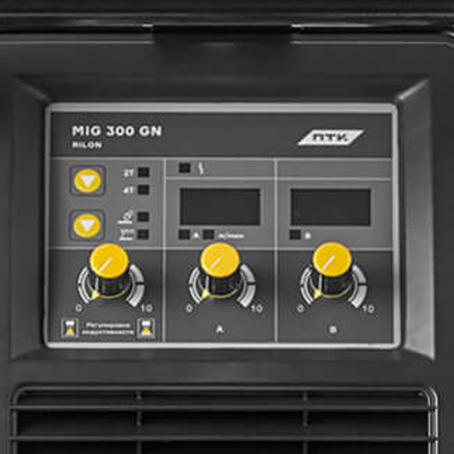 Особенности ПТК RILON MIG 300 GN:На передней панели аппарата находится многофункциональный дисплей с возможностью регулировок силы сварочного тока, сварочного напряжения, индуктивности, регулировки скорости подачи проволоки и других параметров сварочного процесса.Функция индуктивности. При высокой индуктивности аппарат сваривает более мягко, дуга более широкая и эластичная. При низкой индуктивности дуга более сконцентрированная и жёсткая.2Т/4Т режимы работы сварочной горелки. Функция применяется при сварке коротких или длинных швов.Дополнительная функция ручной дуговой сварки MMA. Аппарат позволяет использовать штучные электроды диаметром от 1,5 до 5,0 мм.4-х роликовый металлический механизм подачи проволоки. Используется сварочная проволока диаметром от 0,8 до 1,2 мм. Возможно установить катушку с проволокой весом до 18 кг (D300) и регулировать скорость подачи проволоки от 3 до 16 м/мин.Наличие кнопки прогона проволоки без газа.На задней панели аппарата размещена розетка для подогревателя газа на 36 Вольт.Функция автоматической защиты от перегрева.Сборная платформа для перемещения газового баллона и съёмная боковая полка для сварочной горелки и ЗИП. Наличие в корпусе аппарата скрытого ящика для инструментов.Гарантия 5 лет на аппараты серии ПТК RILON.Комплектация:Инверторный аппарат полуавтоматической сварки – 1 шт.Полуавтоматическая горелка 24 серии – 1 шт.Электрододержатель – 1 шт.Клемма заземления – 1 шт.ЗИП и комплектующие – 1 наборРуководство по эксплуатации – 1 шт.