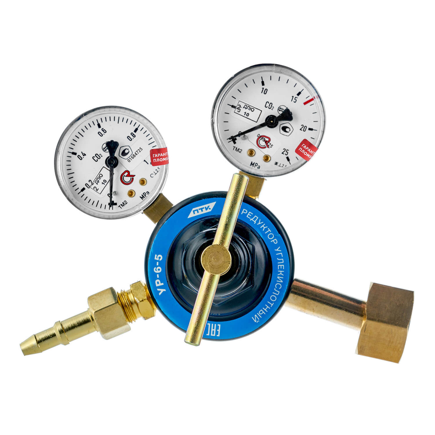 Редуктор углекислотный УР-6-5 с поверенными манометрами предназначен для понижения давления газа, поступающего из баллона, и автоматического поддержания постоянным заданного рабочего давления при газопламенной обработке. Производит тонкую настройку рабочего давления. Срабатывание предохранительного клапана происходит при давлении в 0,6 МПа.