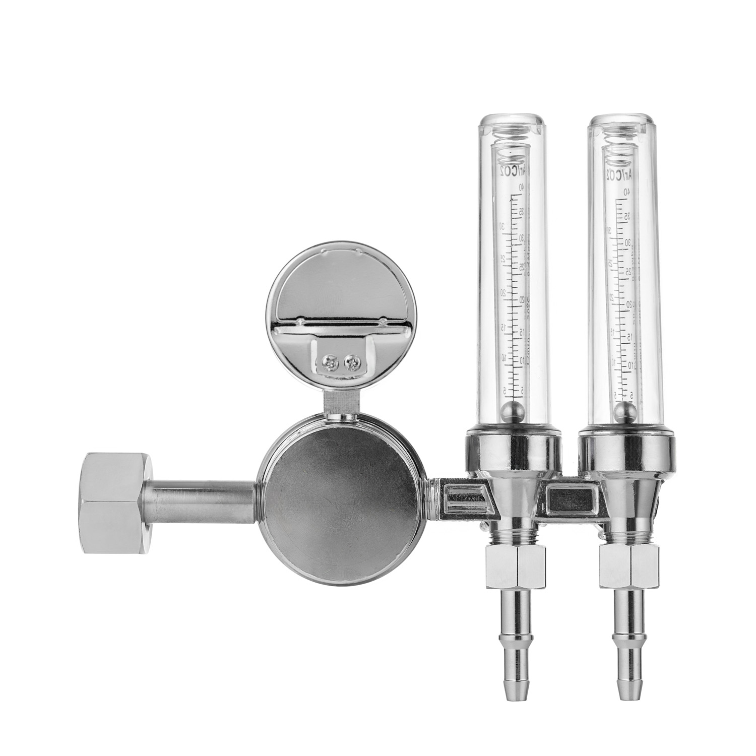 Корпус регулятора изготовлен из латуни, никелированное покрытие. Корпус спаренных ротаметров изготовлен из силумина - сплав алюминия с кремнием. Колбы ротаметров изготовлены из прочного пластика, которые имеют две шкалы Ar/CO2.