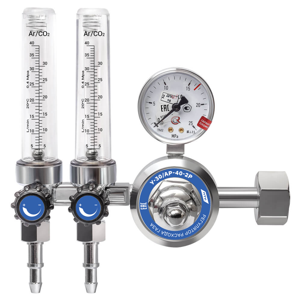 Регулятор расхода газа У-30/АР-40-2Р с поверенными манометрами предназначен для понижения газа и автоматического поддержания постоянным заданного расхода при питании постов и установок в среде защитных газов. Регулятор обеспечивает тонкую настройку и стабильное поддержание заданного рабочего давления (расхода).