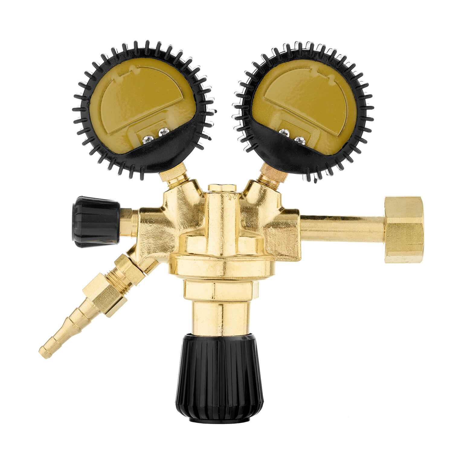 Красная шкала — расход в л/мин для Аргона (Ar).Черная шкала — расход в л/мин для Углекислоты (CO2).Латунный корпус регулятора имеет наибольшую площадь задающей мембраны, что позволяет производить тонкую настройку рабочего давления, особенно на малых величинах. Корпуса манометров дополнительно защищены резиновыми кожухами, которые предохраняют устройства от механических повреждений. На регулятор установлены эргономичные винты из металлопластика.