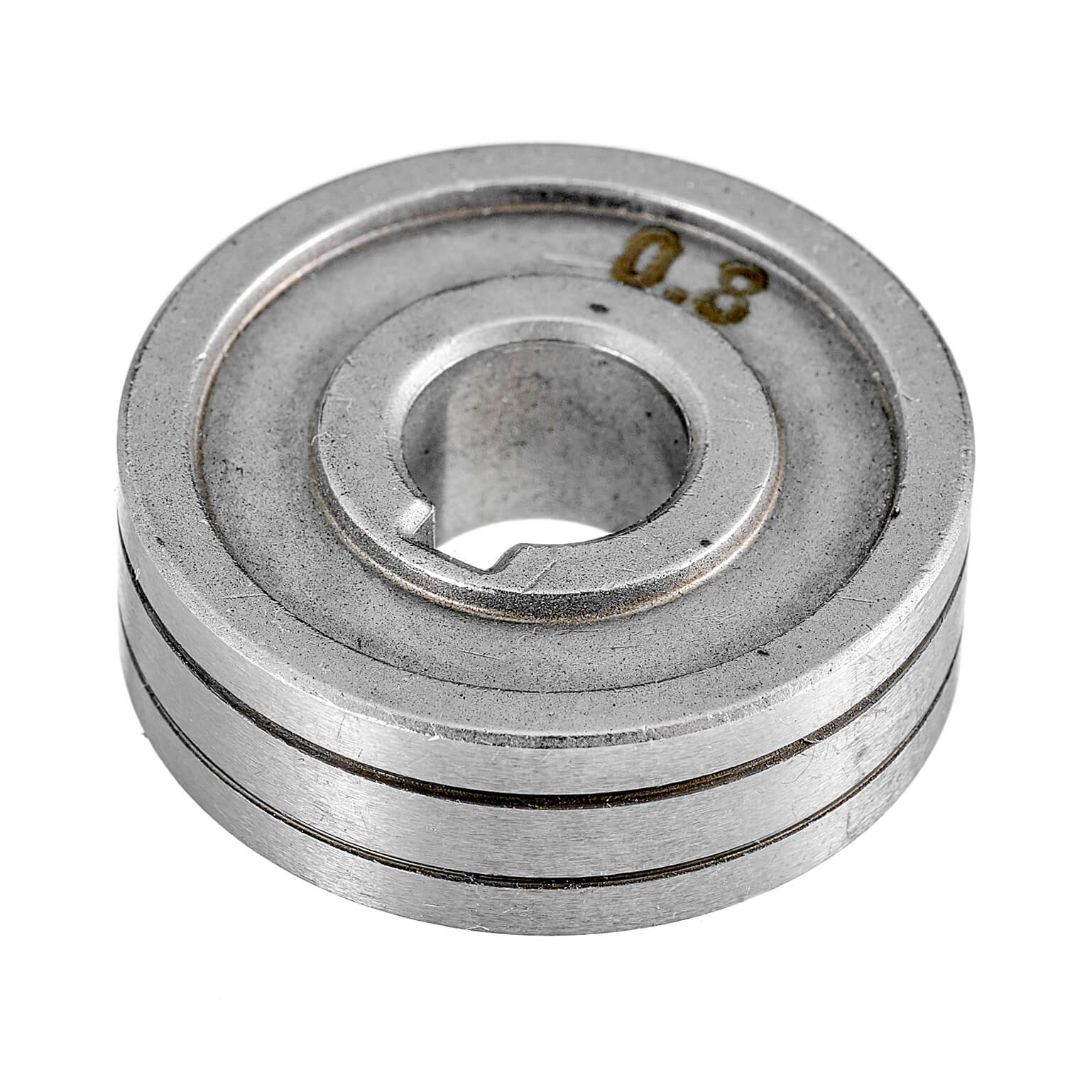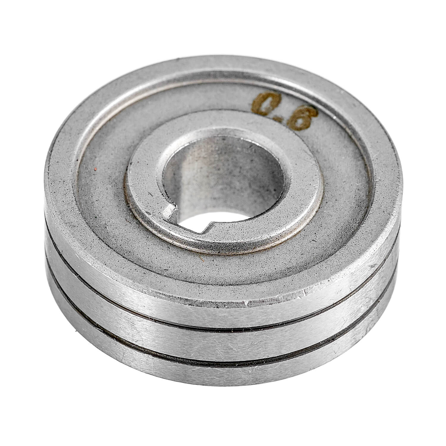 Это сменный элемент подающего механизма, который подбирается в соответствии с видом сварочной проволоки и ее диаметром. Данные ролики предназначены для работы со стальной проволокой диаметром 0,6–0,8 мм. Размер роликов 30х10х10 мм. Подающие ролики имеют две направляющие канавки V-образной формы. При изменении сечения проволоки необходимо перевернуть ролик нужной стороной и использовать его далее.