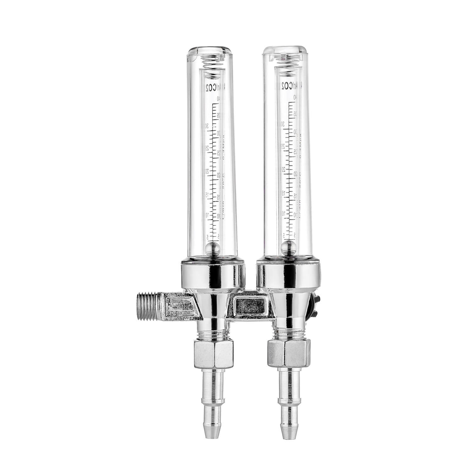 Корпус ротаметра изготовлен из силумина, а колба ротаметра из прочного пластика. Внутри наружной пластиковой колбы, расположена малая пластиковая колба для шарика-поплавка. На ней нанесена двойная шкала расхода газов Ar/CO2, которая показывает расход каждого из них (л/мин).