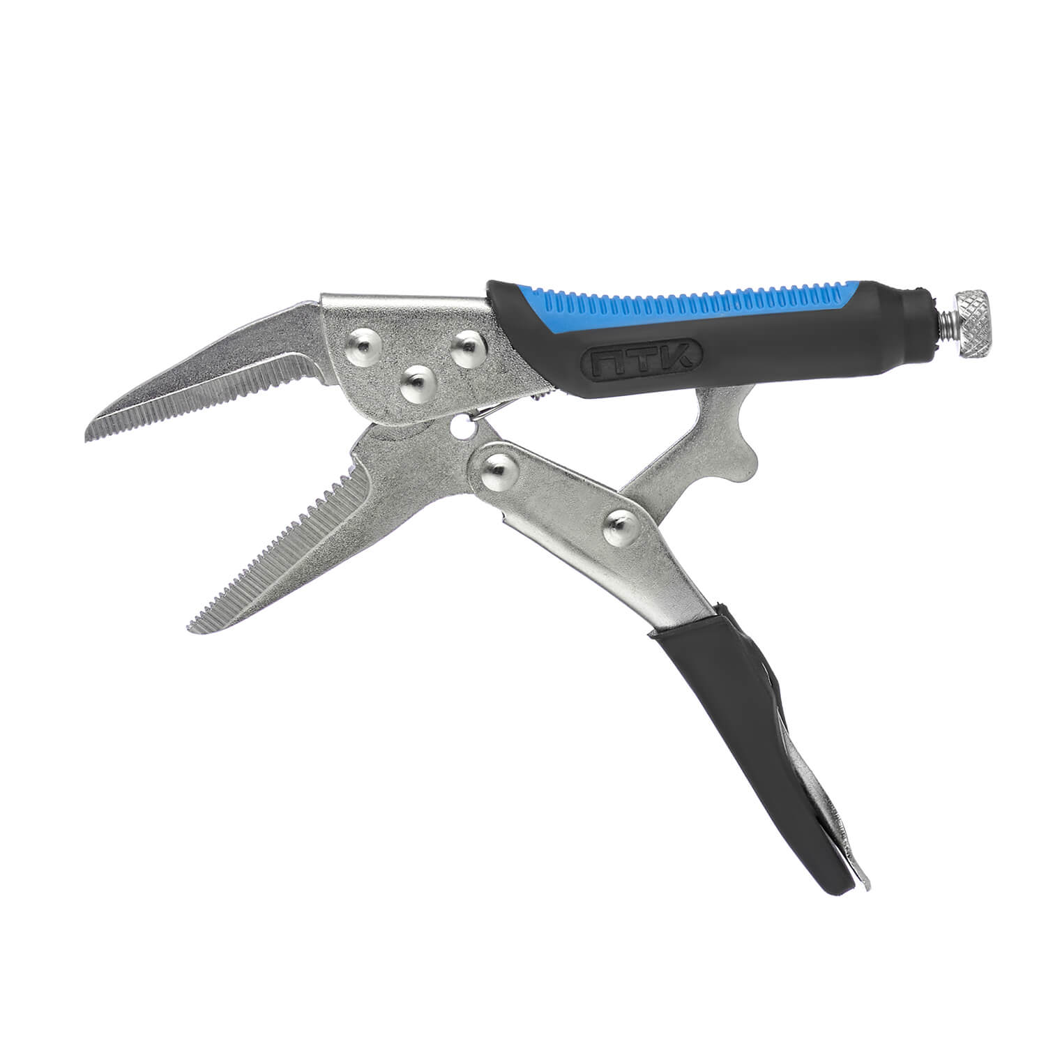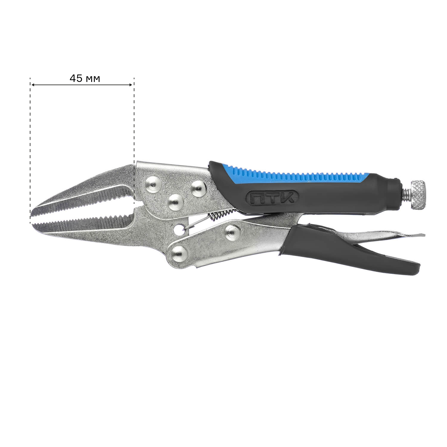 Зажим с губками с насечками и винтом, который расположен на рукоятке и обеспечивает надежную фиксацию при сварке.