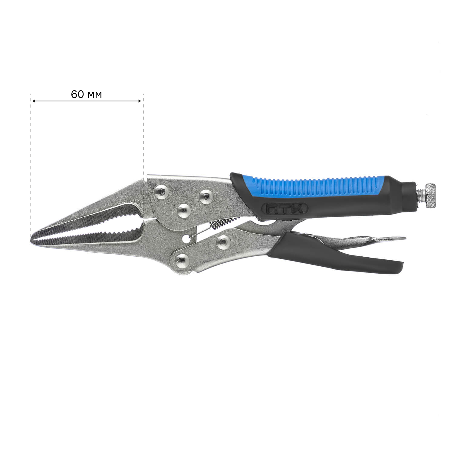 Зажим с губками с насечками и винтом, который расположен на рукоятке и обеспечивает надежную фиксацию. Максимальный размер закрепляемой детали 43 мм. Глубина зажима 60 мм.